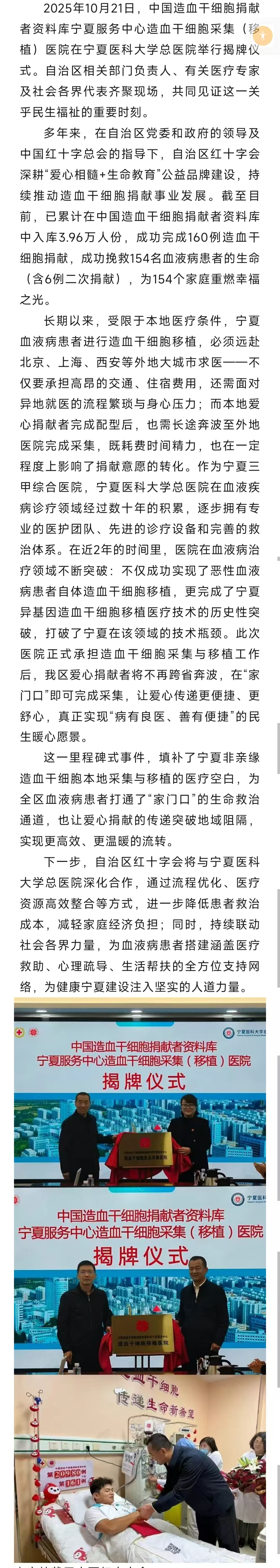 宁夏造血干细胞采集(移植)医院揭牌—填补本地生命救治空白,搭建“家门口”的希望通道