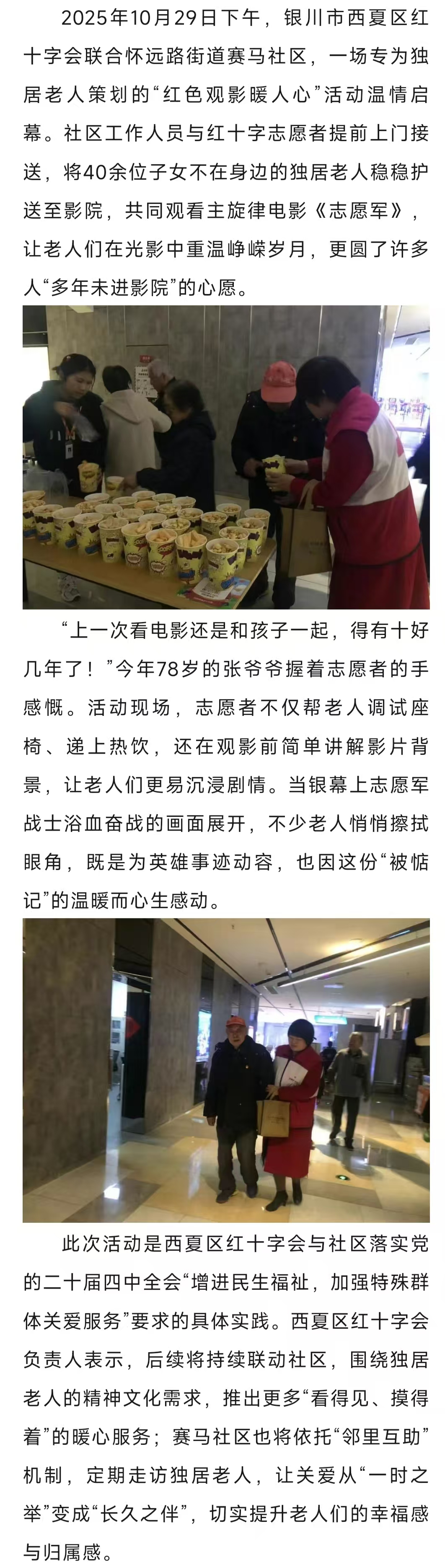 西夏区红十字会携手赛马社区:观影《志愿军》暖夕阳 独居老人重拾影院记忆
