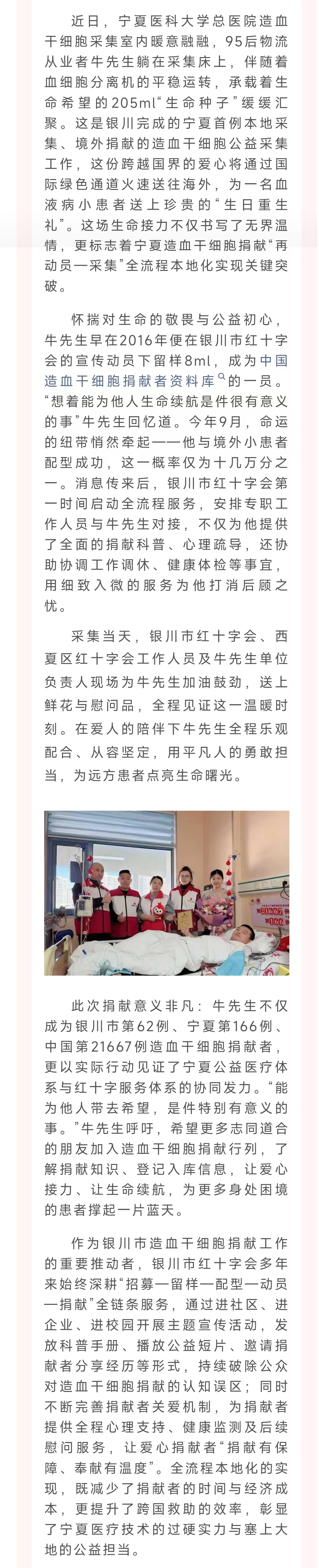 爱心跨山海 生命新续航--银川完成宁夏首例境外造血干细胞本地化采集