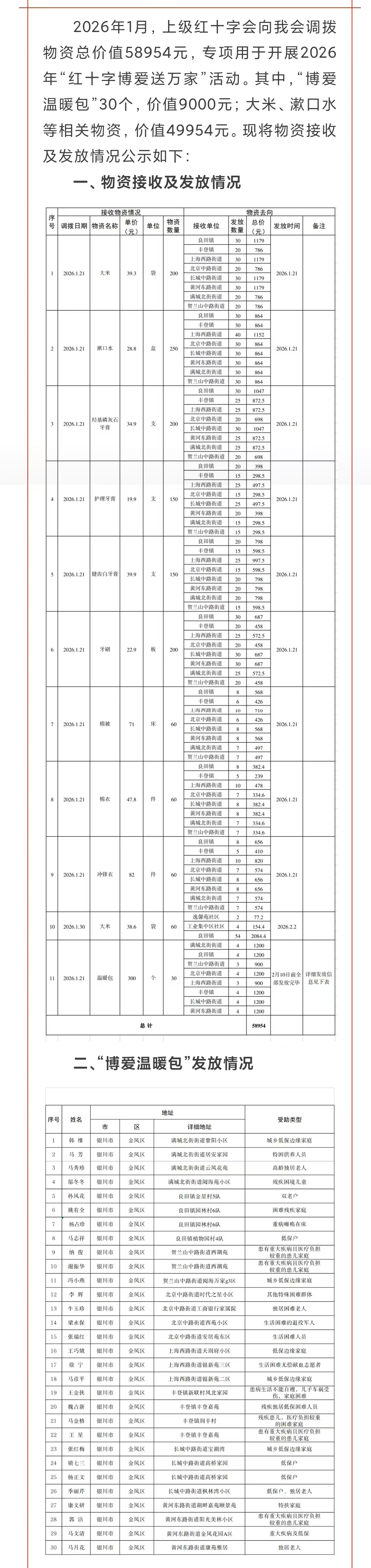 银川市金凤区红十字会2026年“博爱送万家”慰问物资接收发放情况公示